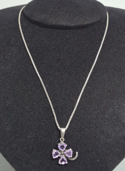 • Colar e pingente em prata no formato de trevo, cravejado de Ametistas. Med.46 cm
