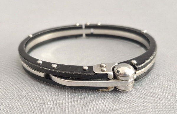• Pulseira americana tipo algema, feita em aço e detalhes em esmalte negro. marcas de uso. Medida interna: 6.5 cm   ------ https://www.walmart.com/ip/Two-Tone-Steel-Handcuff-Bangle-Bracelet-Secret-Shades/162600291?wmlspartner=wlpa&selectedSellerId=1233