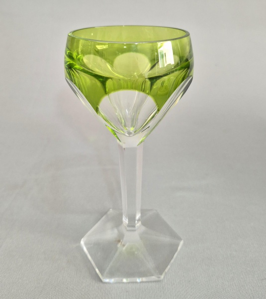 • Antiga taça para vinho do porto em pesado cristal double verde, lapidação dedão, base sextavada. Med. 14.5 cm