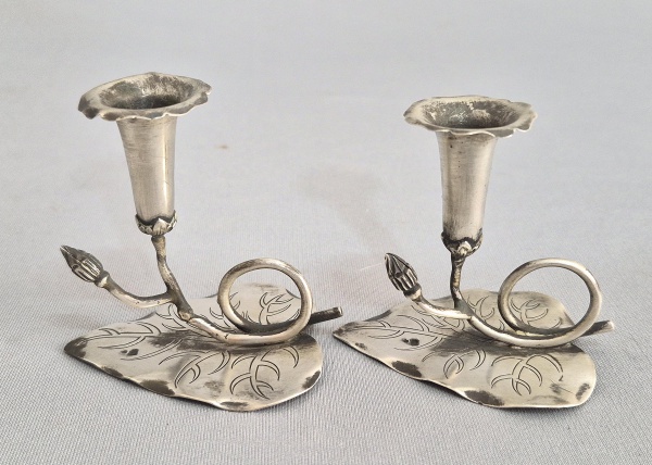 • Par de pequenos paliteiros individuais em Prata portuguesa, no formato de tulipas e folhas. Contrastados. Peso líquido: 50 gramas. Med. 6 x 6.5 cm.