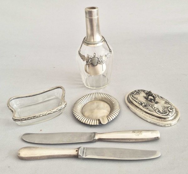 • ADRIANO ALVES, JANUARIO E MOURÃO e outros: Lote com 4 peças em Prata de lei, sendo um covilhete em cristal com borda, uma tampa, uma licoreira francesa, contraste cabeça de Mercúrio com rótulo de garrafa e cinzeiro. Peso líquido somente da Prata: 120 gramas aprox. Medida maior: 10 x 7 cm. Acompanha também 2 facas com contrastes não identificados, à testar. Total de 5 itens.