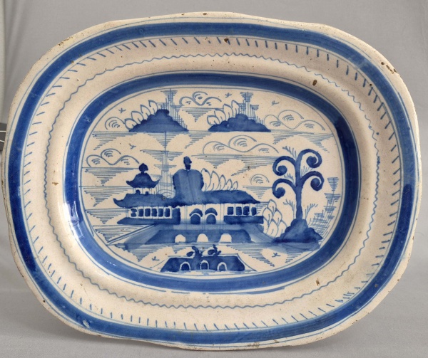 • Antiga travessa em faiança azul e branca, no estilo chinês, decorada com pagodes e paisagens. Sem marca. Séc.XIX. Possui restauro na borda. Med. 38 x 30 cm