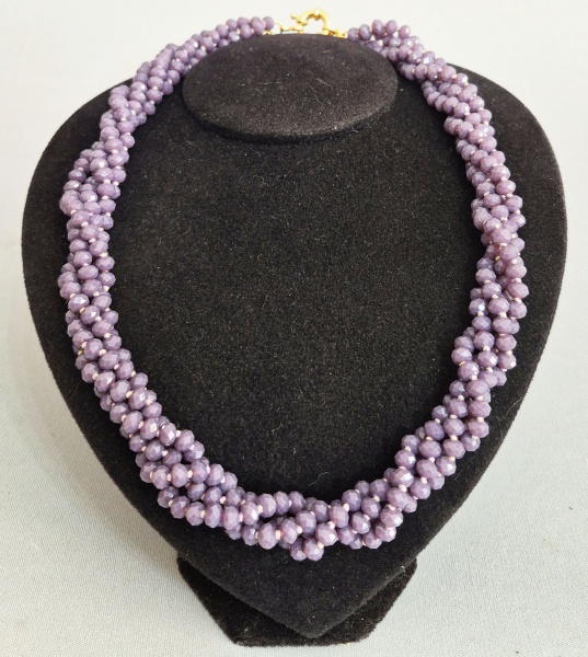 • Colar torcido em belíssimas pedras possivelmente Kunzitas na cor púrpura. Alto brilho. Fecho boia dourado. Med. 55 cm.