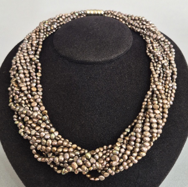 • Max colar torcido com diversos fios em Pérolas de água doce, na cor marrom furtacor. Fecho magnético em metal. Med. 48 cm