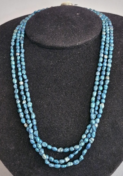 • Colar com 3 fios de Pérolas azuis de água doce verdadeiras. Fecho em metal, ornado com uma roseta esculpida em Madrepérola. Med. 44 cm.