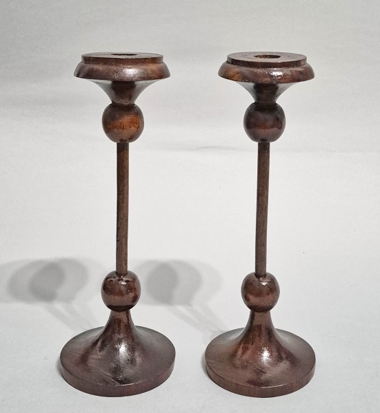 • ANOS 60 - Par de castiçais com design modernista,  esculpidos em madeira. Delicadas colunas ornadas com esferas. Med. 25 cm