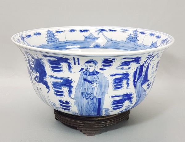 • CHINA, DINASTIA QING - SÉC. XIX/XX - Grande centro ou travessa em porcelana chinesa azul e branca com figuras de imortais e nuvens. Interior decorado com paisagens e símbolos típicos. Sem marca. Med. 27 x 12 cm. Fundo embaixo com imperceptível craquelado no esmalte. Acompanha base em madeira (com perda). Medida total: 27 x 15 cm