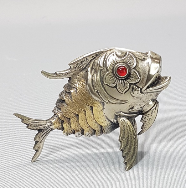 • Polvilhador em Alpaca no formato de peixe com partes móveis, olhos com pedras incrustadas. Marcado na barbatana. Med. 8 x 6 cm.