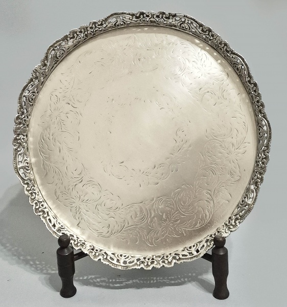 • BRASIL, SÉC.XIX - IMPÉRIO BRASILEIRO - Antiga salva em Prata brasileira, contraste P Coroa, galeria recortada, decorada com coroas do Império brasileiro, folhagens e volutas. Med. 33 cm. Peso: 1.006 gramas. Um dos pés com perda. Teor não identificado.