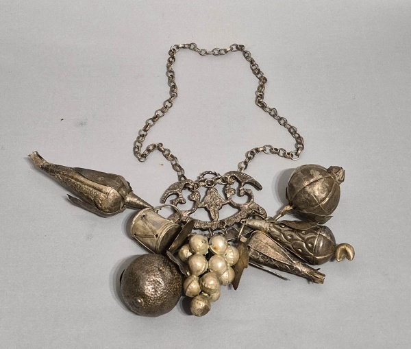 • Antiga penca baiana de balangandãs em metal com corrente e 7 pingentes. Med. 22 x 17 e corrente com 72 cm aproximadamente. Brasil, Séc.XIX/XX.