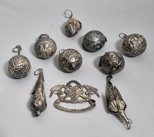 • Antiga penca baiana de balangandãs em metal com 9 pingentes. Brasil, Séc.XIX/XX.. Med. 25 x 25 cm.