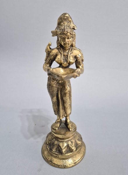 • Pesada e maciça escultura indiana, em bronze dourado, representando deusa com cesto para oferendas. Med. 30 cm