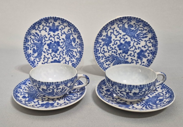 • Duas pequenas xícaras em porcelana japonesa azul e branca, dita 'casca de ovo', decoradas com Fênix e flores. Acompanha 2 pires extras. Med.10 e 6 x 8 x 3 cm
