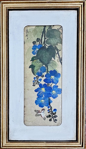 • Antiga pintura japonesa " Pássaro e galho de flores",  Aquarela e guache s/papel, assinada no c.s.d. - Med: 48 x 18 cm