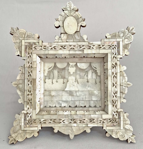 • Raro Diorama com a imagem da Santa Ceia, estrutura em madeira, recoberta por placas de Madrepérola, esculpidas a mão. Europa, Séc.XIX. Med. 23x20 cm. Em excelente estado de conservação, apenas pequenos reparos. Item raro de coleção. VER COTAÇÕES  ------https://www.cordys.co.nz/auctions/BB3/catalogue/0020?category=Miscellaneous -----https://live.brunkauctions.com/online-auctions/brunk/carved-mother-of-pearl-shadowbox-icon-the-last-supper-6423302 ------https://www.invaluable.com/auction-lot/very-rare-19th-century-diorama-of-jerusalem-grand-352-c-d524cb9b99#::text=Lot%20352:%20Very%20Rare%2019th%20Century%20Diorama,of%20Pearl%2C%20Holy%20Land%2C%20Jerusalem%2C%2019th%20Century.