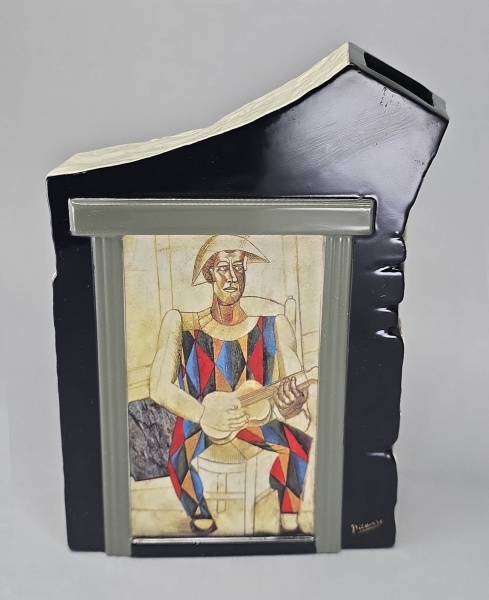 • GOEBEL, Edição Picasso,  edição especial de 1996. Vaso de duas faces no estilo Art Deco, decorado com duas reproduções autorizadas de obras de Pablo Picasso sobre fundo negro.  Assinatura do artista impressa na lateral. Marca e informações na base. Med. 25 x 21 x 5.5 cm