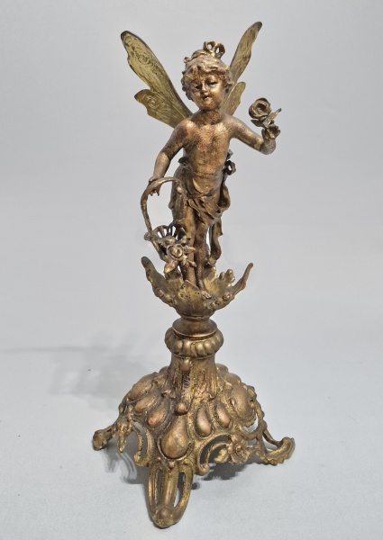 • ART NOUVEAU - Circa de 1900 - Antiga escultura de 'Fada com flores" em Cobre com antiga douração, base em gomos e pés vazados. Sem marca de fundição ou autor. Dimensões: 37 cm