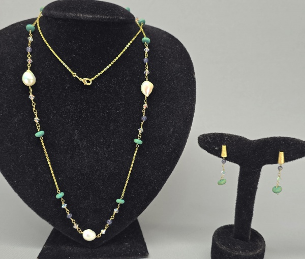 • Conjunto Pérolas barrocas verdadeiras, cristais furtacor, pedras verdes e esferas de Ametistas. Estrutura folheada a Ouro. Acompanha par de brincos.  Med. 81 e 3.5 cm