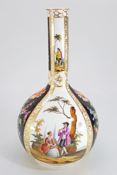 • HELENA WOLFSOHN - DRESDEN, Séc.XIX -  Vaso tipo garrafa em porcelana alemã, elegantemente pintada a mão com farta douração, dividida em quatro reservas, sendo duas com pinturas florais sobre fundo negro e outras com cenas românticas inspiradas nas pinturas de Anthoine Watteau e antigas porcelanas de Meissen. Marca apócrifa AUGUSTUS REX (marca utilizada apenas entre 1878 a 1881 quando foi processada por uso indevido da marca. LEIA O TEXTO ABAIXO. Med. 31 cm. SOBRE A ARTISTA ---- Helena Wolfsohn foi a sucessora de L. Meyer & Söhne. Comprava porcelana branca principalmente em Meissen decorava no estilo das peças mais antigas de Meissen de Johann Gregorius Höroldt. Ela também usou as pinturas de Watteau como inspiração. Em 1878 o negócio foi assumido pela filha de Helena, Emilie Elb. No entanto, no ano 1881, a fábrica de Meissen os processou por usarem a marca AR (Augustus Rex). O estúdio foi forçado a parar de usar a marca na Alemanha e em 1883 na Inglaterra. A compensação pelo uso ilegal da marca foi tão alta que o estúdio quase perdeu liquidez financeira. Em 1893, o marido de Emilie, Leopold Ludwig Elb, tornou-se o único proprietário do estúdio.------ https://www.theoldstuff.com/en/porcelain-marks/category/197-helena-wolfsohn-marks ) ----- VER COTAÇÕES ----- https://www.christies.com/en/lot/lot-4669008 ------https://www.christies.com/en/lot/lot-5802294  ------ https://www.lot-art.com/auction-lots/A-Helena-Wolfsohn-square-formed-bottle-vase-painted-with/41-helena_wolfsohn-25.3.22-tennant ----- https://www.invaluable.com/auction-lot/antique-pair-helena-wolfsohn-dresden-porcelain-va-681-c-2924526bc4?srsltid=AfmBOoqVrn3x79A0FgpwLKYuYL7N9VAtm0iU6mnYfNEWwPsj9BmR2pwb
