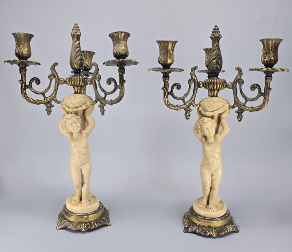 • Par de candelabros italianos para três velas em Bronze e colunas em resina na tonalidade marfim, representando Putim com guirlanda floral. Med. 42 cm.