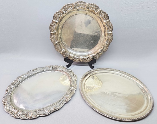 • Três travessas, sendo duas ovais e uma redonda, em metal banhado a prata. Sem marca. As duas maiores medem:  40 cm