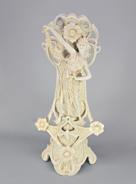 • ART NOUVEAU - Anos 20 - Antigo vaso alto em biscuit, detalhes vazados, adornado com relevo de Ninfa com guirlanda de flores. Numerado no fundo. Med. 35 cm. Duas flores embaixo com restauro profissional.