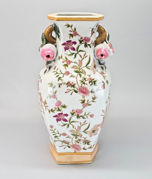 • Elegante vaso sextavado em porcelana chinesa, decorado com flores sobre fundo branco. Alças moldadas no formato de frutos de Romã e folhagens. Sem marca. Med. 37 cm.