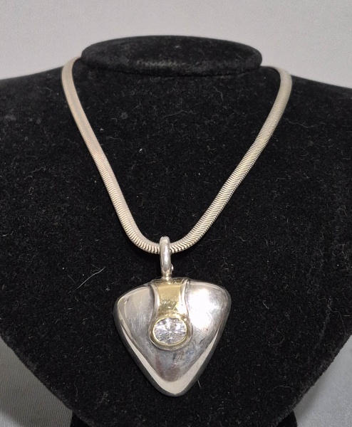 • Colar e pingente cm fecho clip em Prata com detalhes em ouro e zircônias central.Med. 42 cm e 4.5 x 3.5 cm