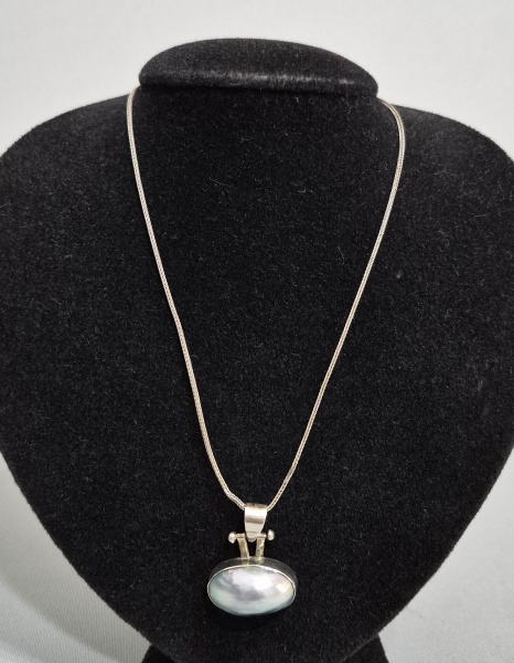 • Colar e pingente em Prata e grande pérola Mabe acinzentada. Med. 41 e 3 x 3 cm