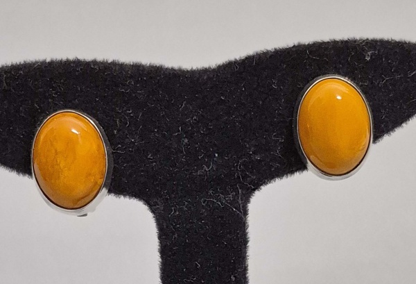 • Par de brincos de pressão em prata e cabuchons em Ambar amarelo. Possui dois contrastes. Med. 2 cm