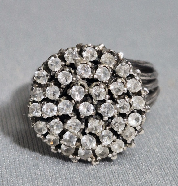 • Anos 40/50 - Anel chuveiro em Prata com banho de ouro branco, cravejado de pedras brancas, possivelmente safiras brancas. Aro 16
