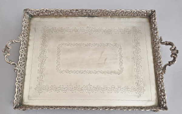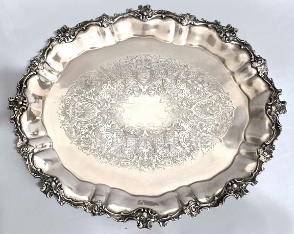 • Enorme e pesada travessa para banquete no estilo Roccaille, metal prateado. Bordas recortadas e cinzeladas com motivos fitomórficos e volutas. Fundo cinzelado. Pés redondos. Sem marca.  Med. 65 x 57 cm