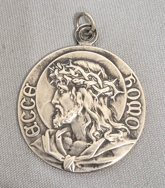 • Antiga medalha sacra em prata: Ecce  Homo com face de Cristo e de Maria. Med. 4 x 3 cm Peso: 13 gramas.