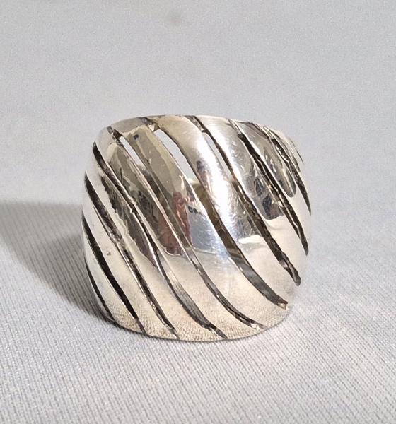 • Anel bombê em prata lisa com frisos fenestrados. Aro 18