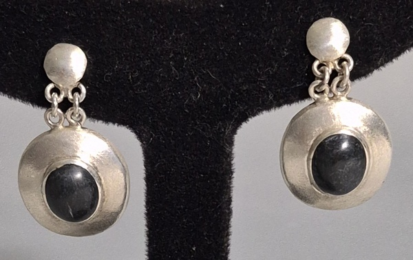 • Par de brincos em prata escovada e cabuchon em ônix. Med. 3.5 cm