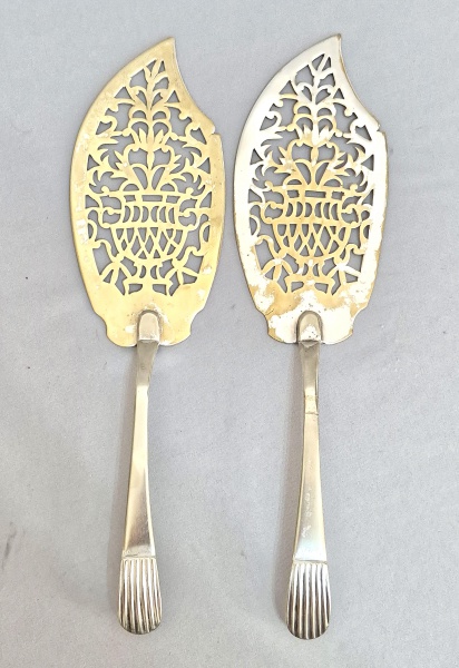 • Par de antigas espátulas para bolo ou doce em metal, cinzeladas e fenestradas. Cabos com acabamentos canelados. Com desgastes.Med. 32 cm