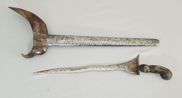 • Adaga Kris Malaio, extraordinária usada para execução, bainha em madeira revetida com capa em prata de lei, cinzelada a mão. Lâmina sinuosa em ferro forjado. Punho em madeira esculpida com detalhes em metal. Medida: 49.5 cm. ---- https://www.dargentleiloes.net.br/peca.asp?ID=2183516