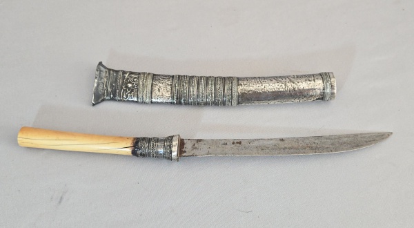 • BURMA/MYANMAR - Séc.XIX/XX - Antiga adaga DHA-HMYAUNG, tradicional do sudoeste asiático. Lâmina forjada a mão, cabo em marfim/osso. Bainha e acabamentos em prata cinzelada e adornada com roseta. Fissuras e marcas do tempo compátiveis com a idade e uso. Medida total: 36 cm. --- VER SIMILARES E COTAÇÕES ---- https://tibetankeepsakes.com/products/a-burmese-dagger  ------ http://www.pralanna.com/shoppage.php?shopid=974376 ------https://petermustonen.com/product/burmese-dha-short-sword/