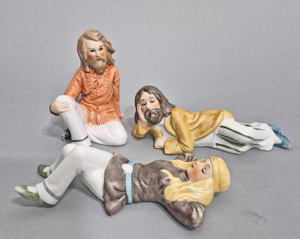 • NORLEANS (Taiwan) - Anos 60/70 - Conjunto com figuras em 'biscuit', representando "HIPPIES", com figurino característico do movimento. Med. 15 cm a maior. Etiquetas no fundo.