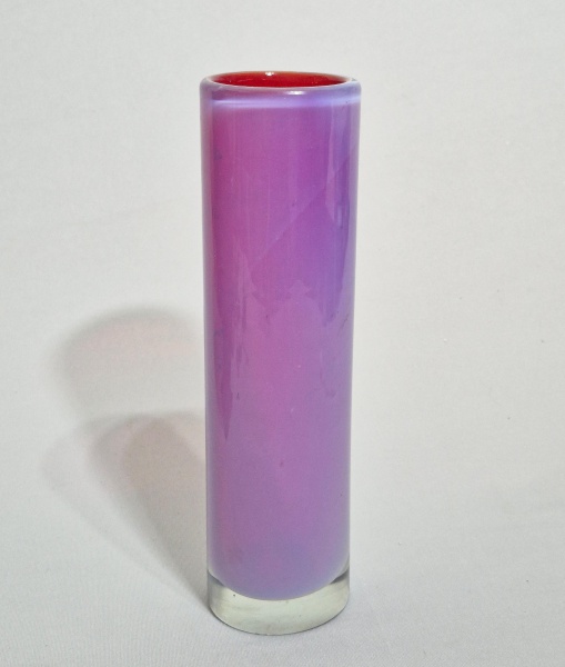 • ANOS 60 - Antigo vaso "Sommerso" no formato cilíndrico em vidro Murano, na cor cereja 'Cramberry' com efeito opalinado branco. Base reta. Med. 24.5 cm