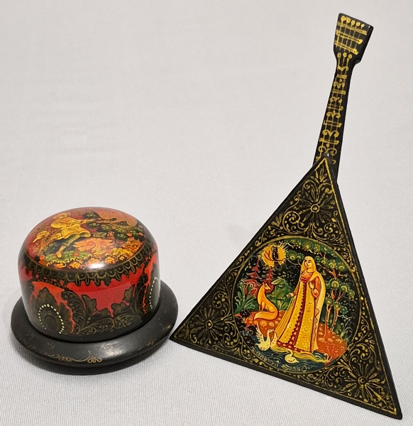 • Duas antigas caixinhas russas em charão, pintadas a mão. uma no formato de balalaica e outra redonda assinada Suricov. Originárias da região de Mstera. Med. 11 x 9  6 cm a maior. --- ---- https://www.themoscowtimes.com/2019/12/31/miniature-miracles-russian-painted-lacquer-boxes-a68714  ---- https://cherrycache.org/2020/08/23/the-legendary-art-of-the-russian-lacquer-miniature/