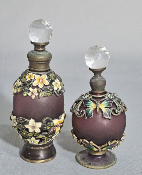 • Dois perfumeiros em vidro purpura, guarnições em metal e pedras. Decorados com flores e borboletas esmaltadas. Med. 11 cm do maior.