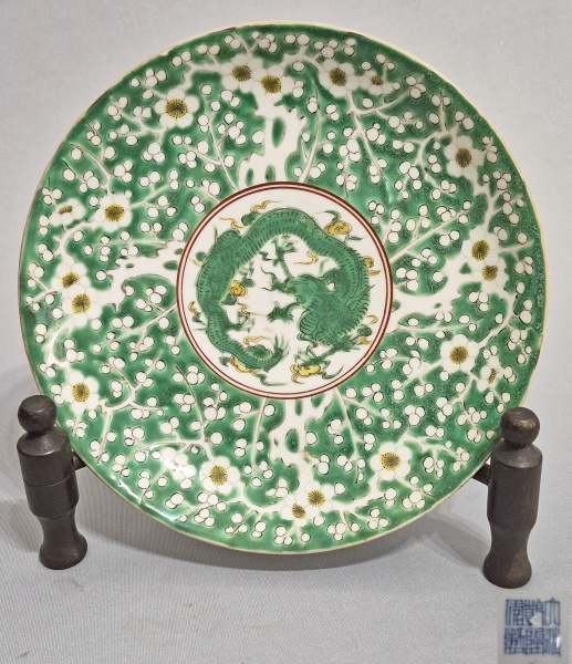• prato decorativo confeccionado em porcelana oriental, de formato circular, com decoração esmaltada em tons de verde, branco, amarelo e detalhes em vermelho, apresentando ao centro dragão estilizado, ladeado por motivos florais e vegetalistas em toda a aba; verso com marca apócrifa em azul sob o vidrado e elementos florais ao redor, medindo 22cm.