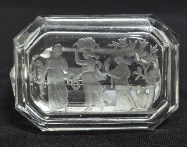 • Antigo cinzeiro com tampa em cristal europeu incolor, delicadamente lapidado com cena clássica com figuras femininas. Alguns pequenos bicados na borda. Med. 9.5 x 7.5 x 5 cm