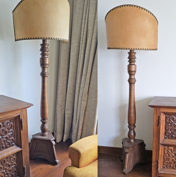 • MONTPARNASSE - Par de grandes e altos tocheiros em madeira de lei, cúpulas em pergaminho.  Altura 171 cm e  medida total com cúpula 201 cm.